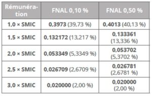 - Tdelta : 0,3773 (FNAL 0,10 %) ou 0,3813 (FNAL 0,50 %) en tenant compte de la suppression des taux réduits AM/AF